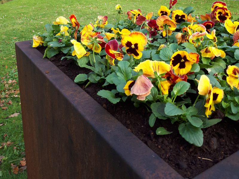 Frederiksoord – De Cortenstalen bloembakken op zichtlocaties in Frederiksoord en Wilhelminaoord, geplaatst door de Dorpsgemeenschap en De Ronde van het Sterrebos, zijn opnieuw gevuld — dit keer met vrolijk gekleurde viooltjes.